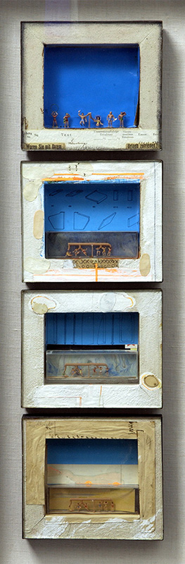 In seinen Objektkästen bietet er dem Betrachter eine Raumdarstellung, die ohne die Gesetze der Perspektive auskommt.
