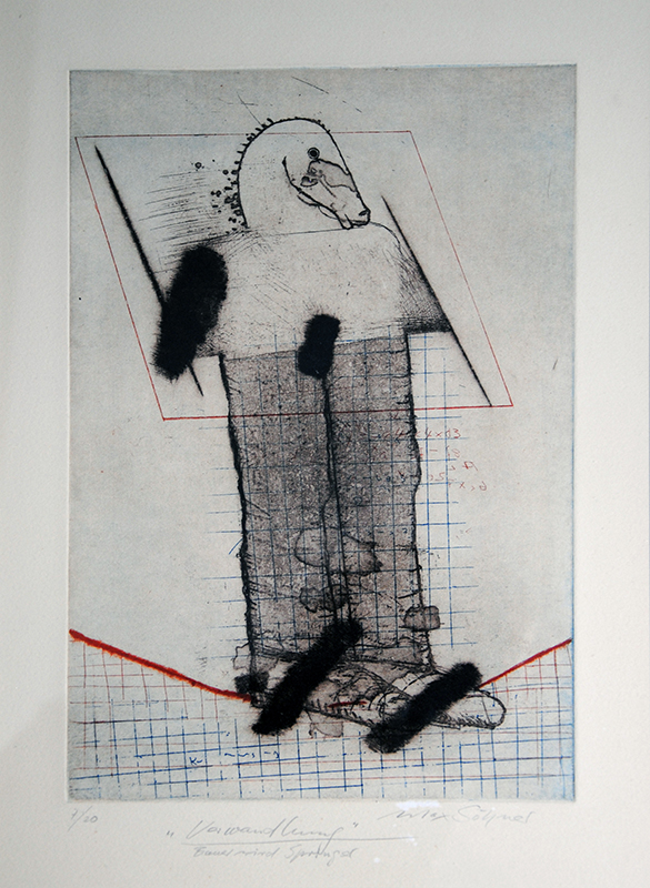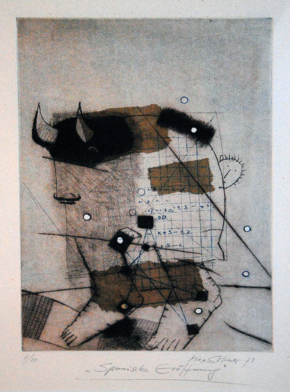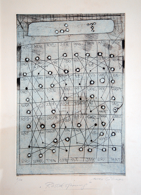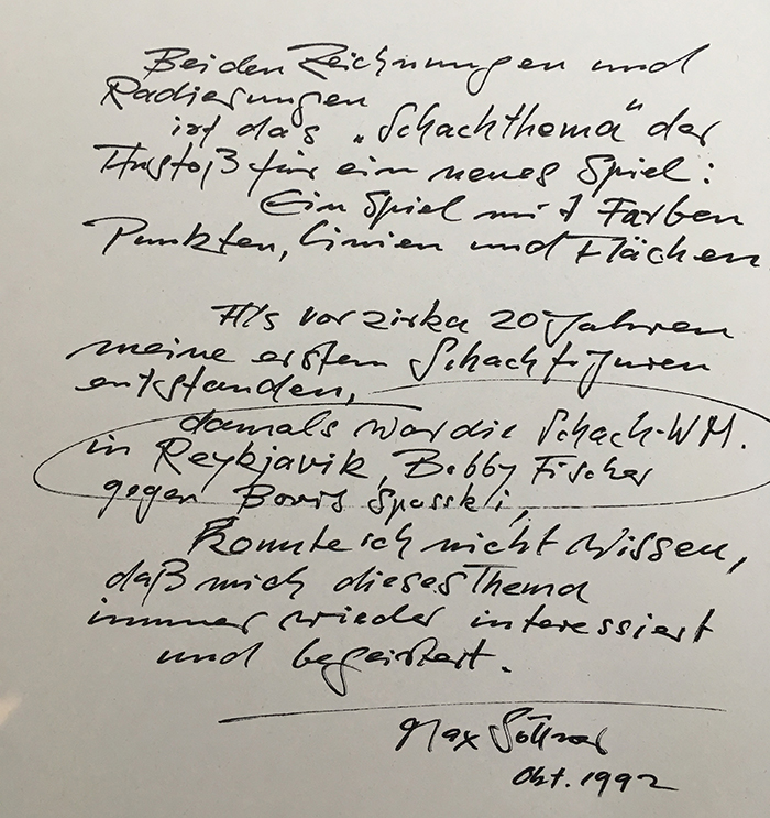 Bei den Zeichnungen und Radierungen ist das „Schachthema“ der Anstoß für ein neues Spiel: Ein Spiel mit Farben, Punkten, Linien und Flächen.