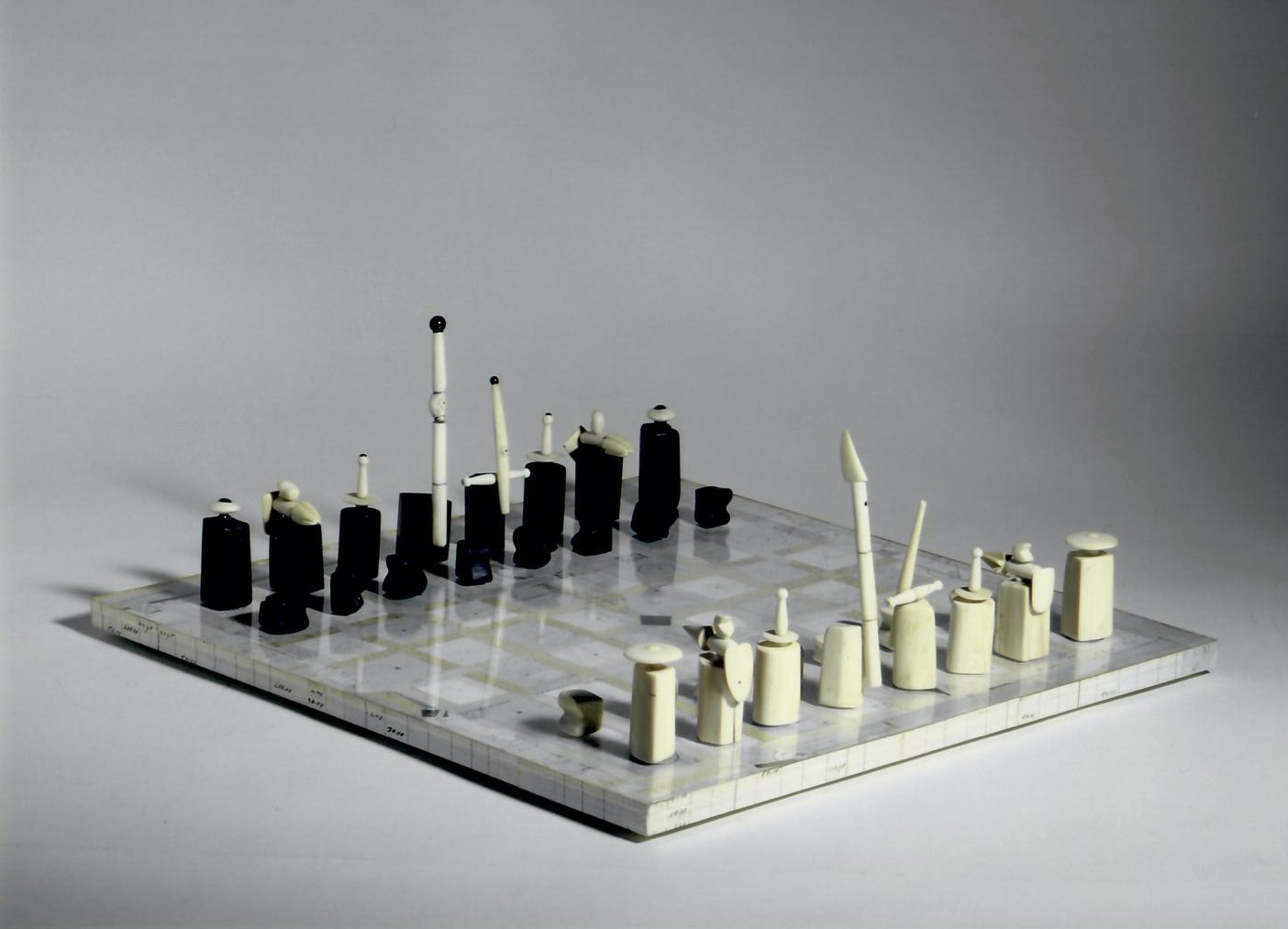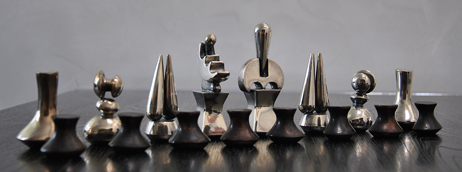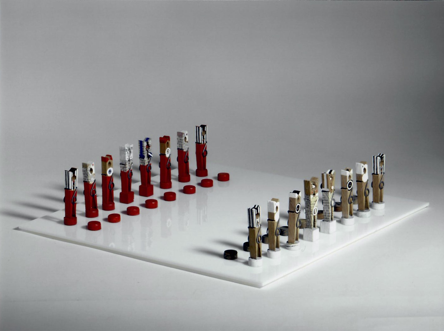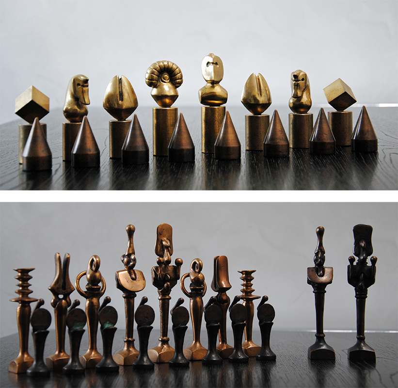 Das war es, was ihn inspirierte. Er wurde selbst zum Schachspieler und entwickelte neue Ideen und Formen. Wäscheklammern wurden in Schachfiguren verwandelt, filigrane Holzstücke wurden mit Papier collagiert, Elfenbein, Silber und Bronze kamen zum Einsatz. Und jeder Figurensatz besticht durch seine formale Ruhe und durch seine Lebendigkeit im Kampf auf dem Schachbrett.