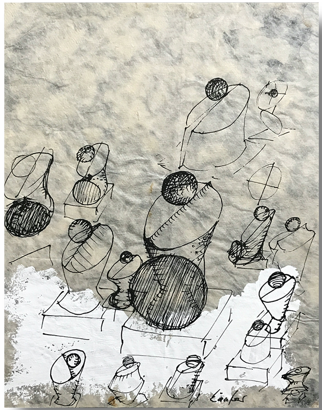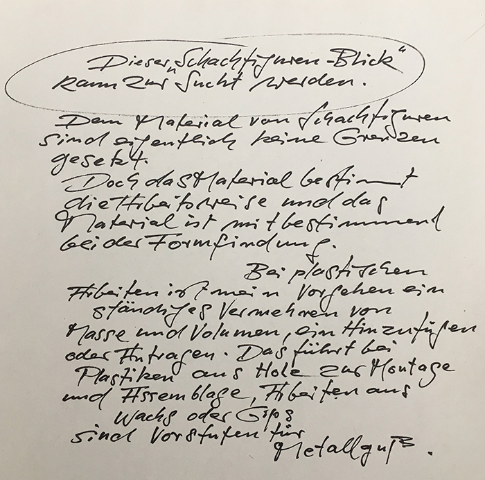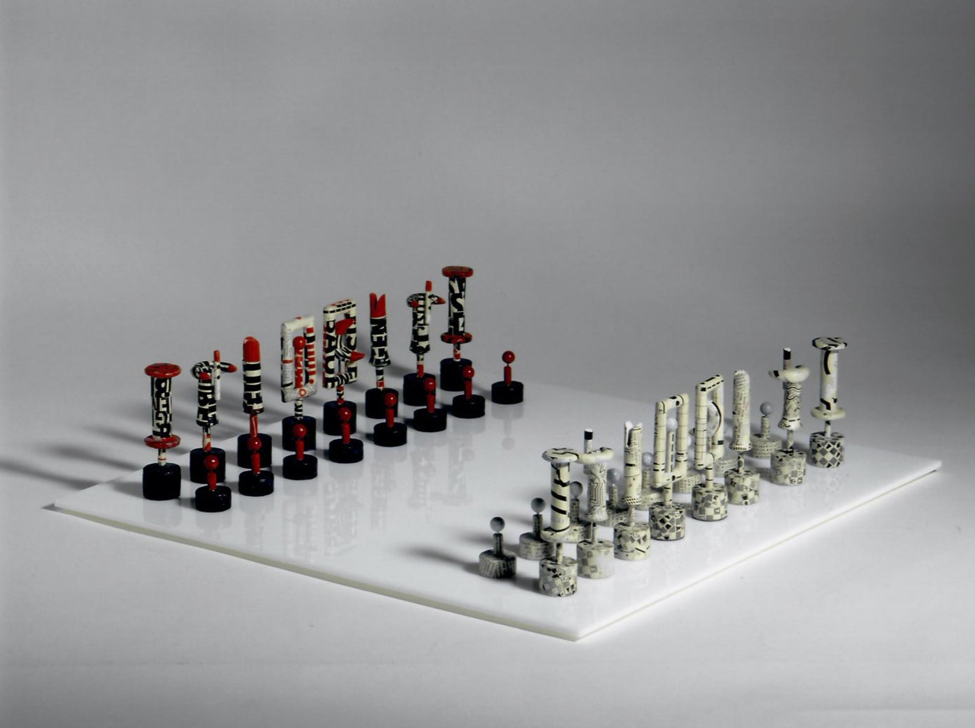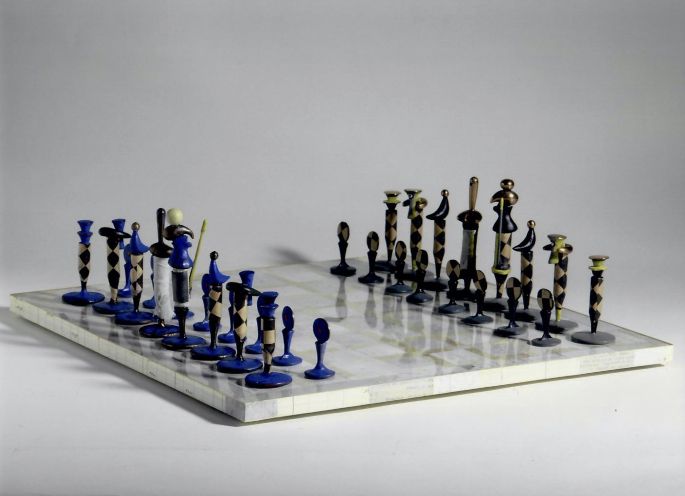 Das war es, was ihn inspirierte. Er wurde selbst zum Schachspieler und entwickelte neue Ideen und Formen. Wäscheklammern wurden in Schachfiguren verwandelt, filigrane Holzstücke wurden mit Papier collagiert, Elfenbein, Silber und Bronze kamen zum Einsatz. Und jeder Figurensatz besticht durch seine formale Ruhe und durch seine Lebendigkeit im Kampf auf dem Schachbrett.