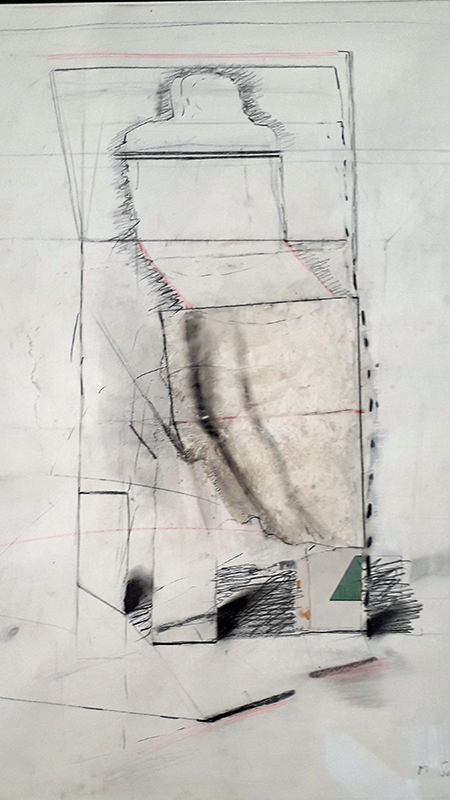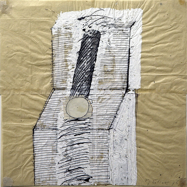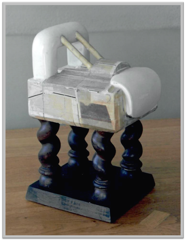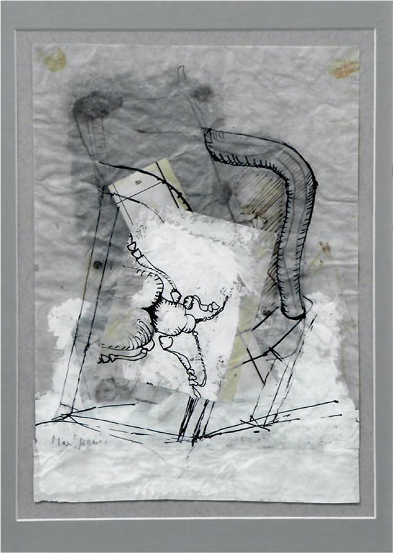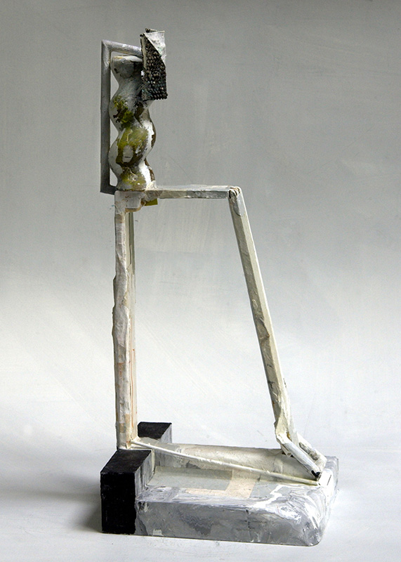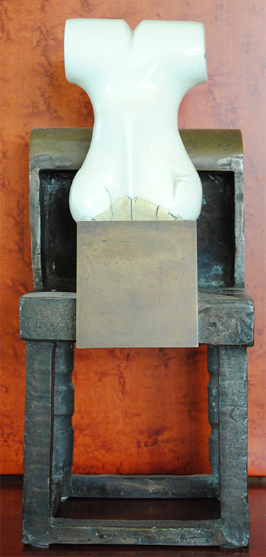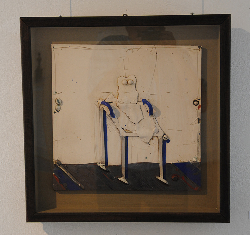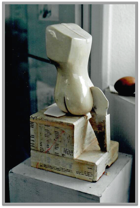 Eine Zeit lang hat sich Max Söllner, mit dem Werkstoff Ton, mit „Figuren“ – nennen wir es „Torsi“ beschäftigt. Eines Tages setzte Max Söllner einen Torso aus Ton auf einen kleinen Stuhl und entwickelte so den Grundgedanken zu einer „Neuen Collage“, zur „Stuhlfigur“.