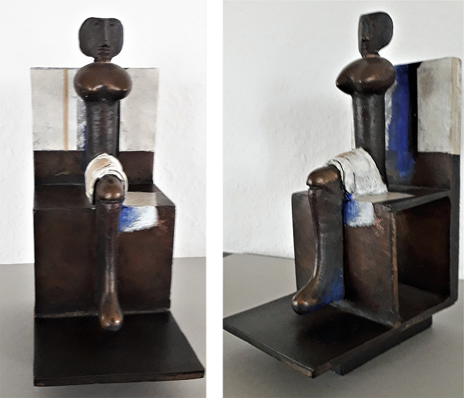 In einer Zeichnung skizziert, entwickelt er Stuhlfiguren, mal mit, mal ohne Be-Sitzer, wo der Mensch mit seinem Sitzmöbel zum „Gesamtsitzwerk“ verschmilzt. Viele dieser Skizzen setzt Max Söllner in die Tat um: in Zeichnungen, in Ton- und Porzellanfiguren, in Collagen oder in (meist) collagierten Bronzeplasiken.